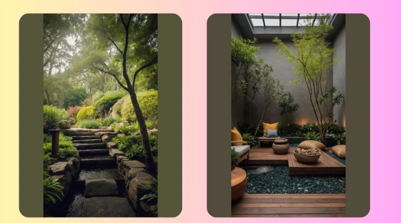 Just when you thought it couldn’t get any cooler (literally!), there’s a little babbling stream tucked between those awesome wooden walkways and giant rocks. It’s basically nature’s white noise machine, perfect for when you just want to zone out and forget about homework. Picture yourself kicking back in that stylish indoor space, with big glass windows blurring the lines between your living room and this epic green oasis. This isn’t just a garden; it’s a personal cool-down resort where even the air feels refreshed, thanks to all that glorious shade keeping things breezy.