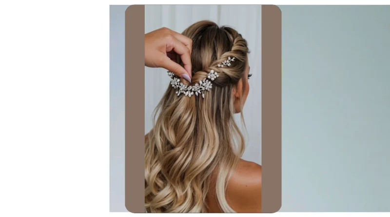 This hairstyle is seriously drop-dead gorgeous! Imagine walking down the aisle looking like this – all flowing waves and a cute little braid. It’s like something out of a fairytale, but way more stylish. The sparkly hairpiece and those delicate flowers? They just add the perfect touch of “wow” without being too over-the-top. It’s the kind of wedding hair that will make everyone say, “I want that!”