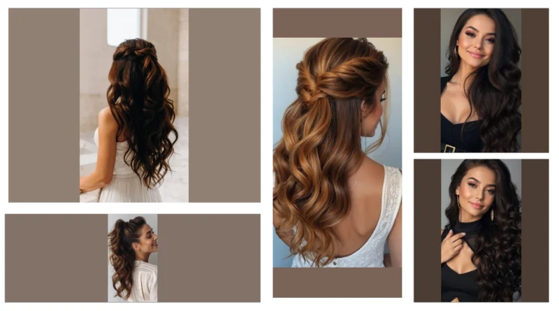 Imagine you’re about to go to a big event, and you want your hair to be extra special. The picture shows some really cool curly hairstyles that would definitely get you noticed. It’s like a stylist went wild with a curling iron! There’s one with braids that look like a fancy crown, and another that’s a super long, cascading waterfall of curls.