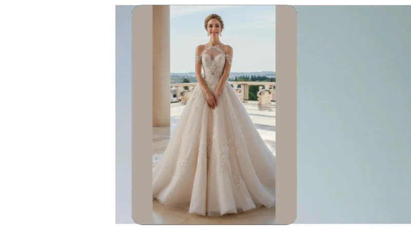 Seriously though, look at that detail! All the delicate lace and embroidery? It’s like someone took a bunch of tiny flowers and stitched them onto the dress. The whole thing is so pretty, it’s almost too good to be true. Imagine how amazing you’d feel wearing it – like a queen walking down the aisle, except instead of a royal crown, you have a tiara of glitter and happily ever afters! This wedding dress isn’t just a dress; it’s a dream!