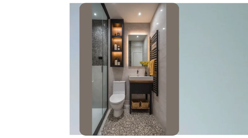 Look at those awesome built-in shelves! Who knew a few neatly stacked towels and some cool-looking soap bottles could make a bathroom look so grown-up and organized? Those little candles aren’t just for emergencies; they add a super cozy, chill vibe, making it feel like a fancy retreat. Plus, the lighting, from the cool wall lamp to the bright ceiling spots, makes everything glow just right. It’s all about those thoughtful bathroom interior design choices that turn a basic washroom into a serene hangout spot where you can unwind and maybe even practice your future award-winning shower singing.