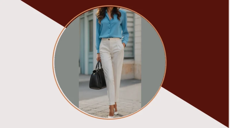 Check out this outfit! Our friend in the picture is rocking a cool blue shirt paired with some seriously chic white trousers. Let’s be real, wearing white pants outside is basically a superpower – one wrong move with a rogue juice box or a muddy puddle, and suddenly you’re starring in your own fashion disaster movie. But hey, she’s pulling it off with zero fear, probably because these ‘women trousers outfits’ are designed to make you feel like you can take on anything, even those sneaky chocolate stains that appear out of nowhere.