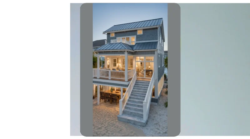 You know, if my math teacher asked where I spent my summer vacation, I’d probably point at this picture and say, “Right here, soaking up rays and pretending I don’t have a care in the world!” This beach house design is basically yelling, “No shoes allowed!” That big patio looks perfect for eating dinner outside, maybe even having a serious negotiation with a seagull over who gets the last french fry. It screams ‘chill vibes only’ and looks way better than my messy room, that’s for sure.
