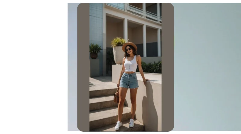 This outfit isn’t just about the tank top though; it’s a whole mood! Her denim shorts are the perfect laid-back partner, comfy enough for exploring but still super stylish. And let’s not forget those crisp white sneakers – they’re basically saying, “I’m ready for adventure, but also really good at looking effortlessly put-together.” To top it all off, that cool hat and sunglasses aren’t just for sun protection; they add a whole level of ‘I’ve got my life together’ chic. It’s the kind of combo that makes you look like you’re always ready for a sunny day, a spontaneous trip, or just conquering your daily errands with maximum style and zero sweat.