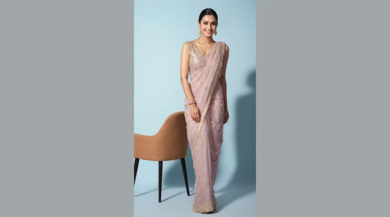 But let’s be real, while the entire saree is stunning, that matching saree blouse is seriously doing some heavy lifting! With its sheer, embroidered sleeves and delicate V-neck, it’s not just a base layer; it’s practically a statement piece on its own. It’s the kind of blouse that whispers, “Yeah, I’m part of a super elegant ensemble, but I could totally rock a pair of jeans too, if I wanted to.” Plus, finding a saree blouse that fits perfectly and looks this good? That’s like winning the fashion lottery, especially when you consider all the tiny details that go into making it look so seamless. It’s the unsung hero, making sure the entire outfit shines bright!