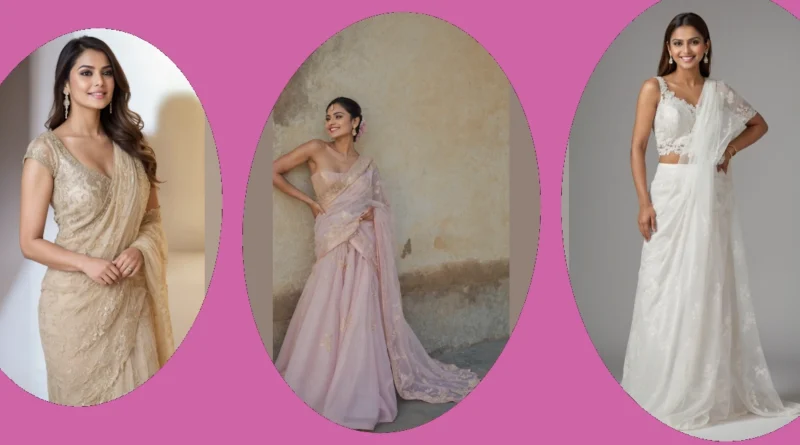 Check out this look! This model is absolutely rocking a super elegant saree, and seriously, she looks like she just floated out of a fairytale. The creamy color with all that gold sparkle is giving major princess vibes, but like, the cool, modern kind who also nails her exams. It’s not just any saree, though; the way it’s draped highlights that amazing one-shoulder saree blouse, making it look totally effortless and chic. You know, the kind of outfit that probably took hours to get just right, but she makes it look like she just threw it on after a casual spa day.