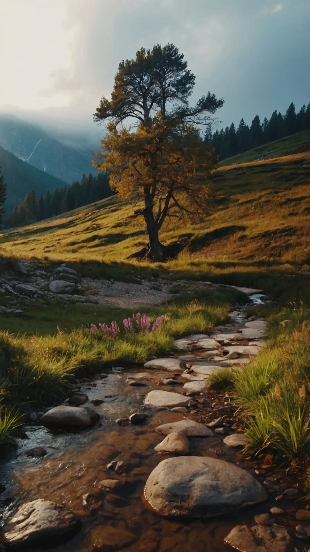 This picture is like a scene from a storybook, isn’t it? You can just picture a little gnome hopping across those stepping stones, or maybe a friendly dragon taking a sip from the cool, clear water. The tree stands tall, like it’s the king of the forest, watching over its little river kingdom. The mountains in the background look kind of mysterious, like they’re holding a big secret. It’s the kind of landscape that makes you want to sit down and just enjoy the view for a while, right?