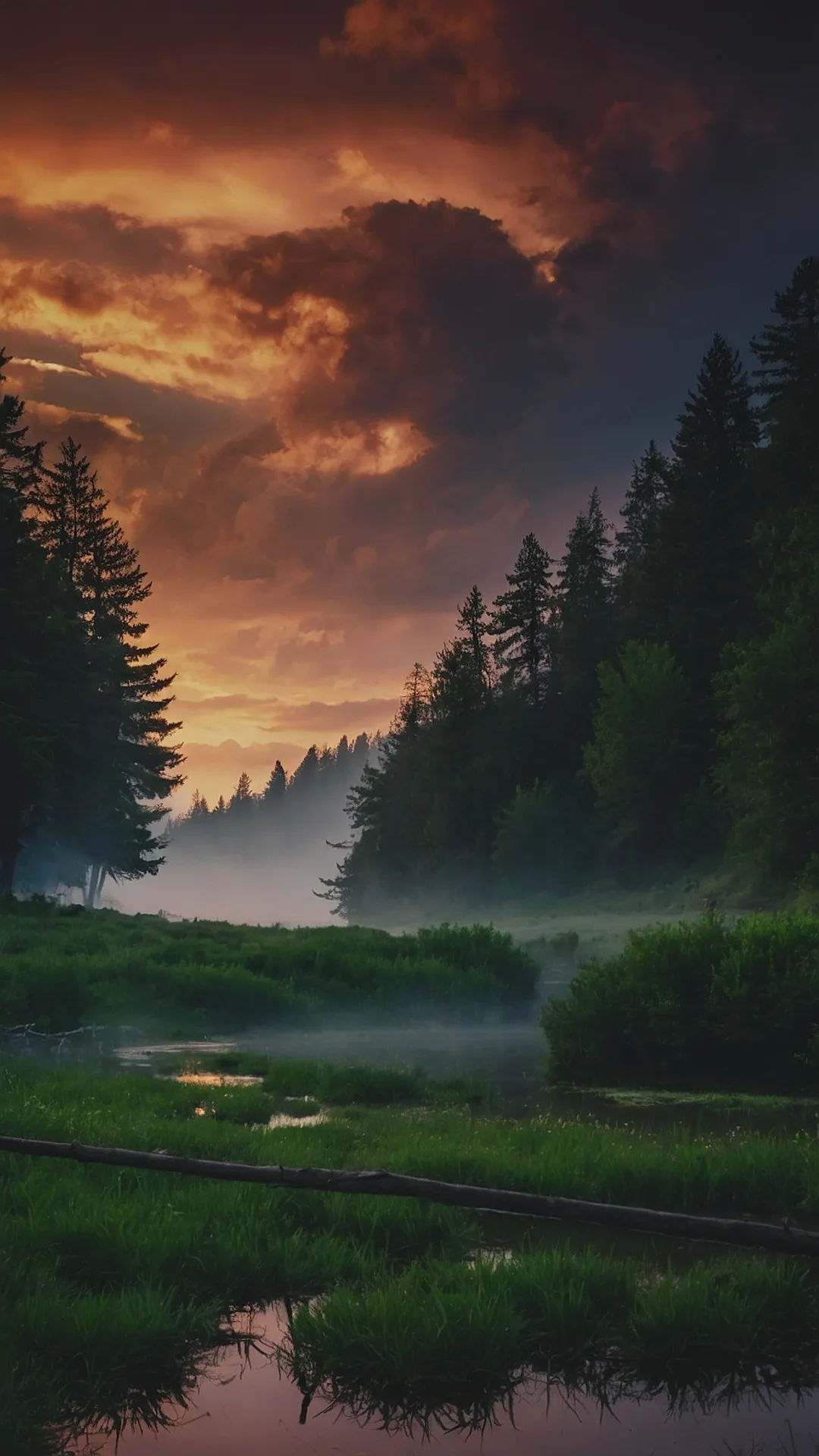 It’s like the whole forest is just waking up and stretching its arms and legs, ready for a new day! The colors in the sky are super pretty, and the water looks so calm and peaceful. Maybe there’s a little bit of magic hiding in the fog. You almost expect to see a tiny fairy or a mischievous gnome pop out from behind a tree. It’s a perfect example of how nature can be beautiful and mysterious at the same time, and it makes you want to go outside and explore!