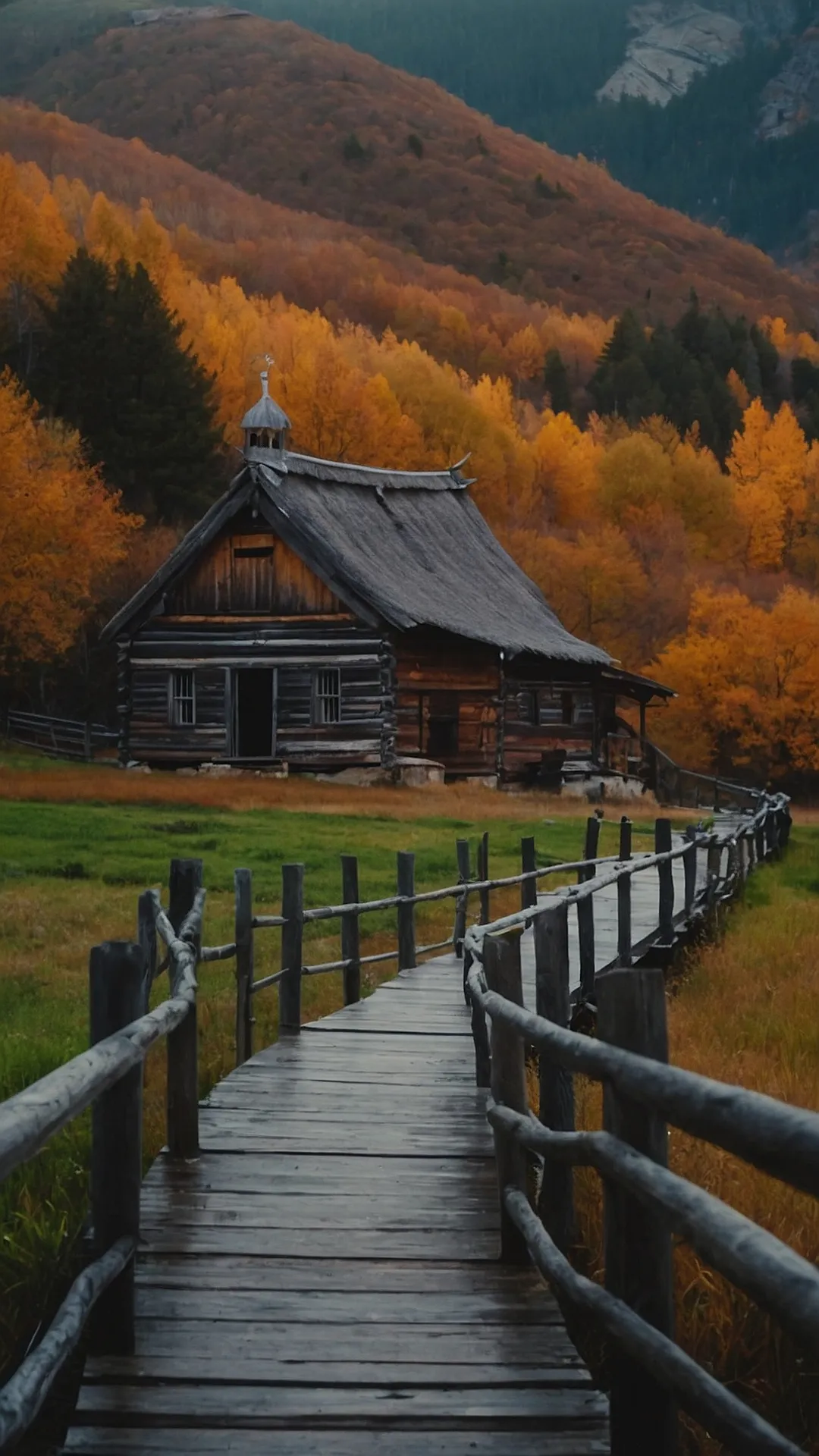This photo makes you feel like you’re stepping into a fairytale! Just imagine: You’re walking along that winding wooden path, the soft sound of your shoes on the wet wood echoing through the crisp air. You reach the end of the path and there it is – a cozy cabin nestled amongst the trees, with a roof that looks like it’s made of a million fallen leaves. The trees have changed colors, turning the hills into a giant, colorful painting! You might even see a friendly squirrel scurrying past, its bushy tail bouncing in the breeze.