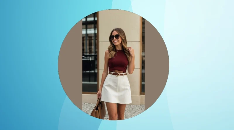 So, you’ve got to look sharp for work but also want to keep that summer vibe alive? This outfit is like the boss who secretly dances to reggaeton in their office – professional on the outside, party on the inside! The burgundy top and white shorts combo is totally chic, and the tan accessories add a touch of sophistication. Just maybe skip the actual samba moves during your presentation.