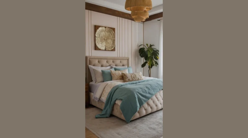 So, you want to design your bedroom, huh? This picture shows one style that’s kind of like if a chill beach bum decided to become a fancy minimalist. The light blue walls and ocean-colored pillows make you think of the beach, but the giant wooden headboard and the cool woven lamp say, “Hey, I’m also into rustic chic!” It’s all about mixing comfy and stylish without going overboard.