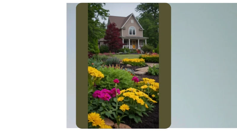 This picture shows a house that’s got it going on! They’ve got a beautiful flower bed bursting with vibrant colors right in front of their house. It looks like they put a lot of love into making it look this amazing, like a real-life painting! Imagine looking out your window every morning and seeing all those gorgeous colors – it’d make you feel happy even on a Monday, right?