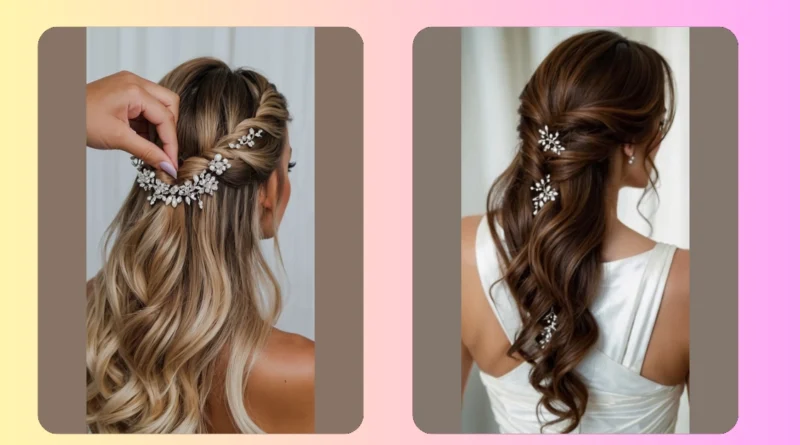 Wowza! Check out this hairstyle—it’s like something straight out of a fairytale! Those sparkly hair accessories are totally dazzling, and the loose curls are so romantic. It’s the perfect blend of elegant and fun, exactly what you’d want for your big day (or even a prom!). Imagine yourself walking down the aisle with hair this stunning – all eyes will be on you! Seriously, this hairstyle could make even the grumpiest person crack a smile.