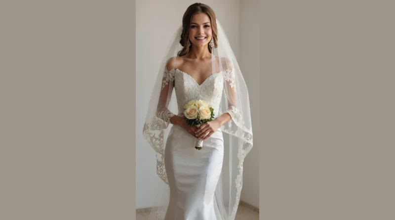 Getting ready for a big day in a dress like this must feel pretty epic. Think of all that white fabric, the fancy lace sleeves that look like they took forever to make, and that long, flowy veil! This classic style makes you look like you stepped right out of a fairytale, ready to walk down the aisle… just try not to trip on that skirt or get the veil caught on a chair, that’s the real challenge. You’d feel like a total movie star, ready for your close-up, probably hoping nobody steps on your train.