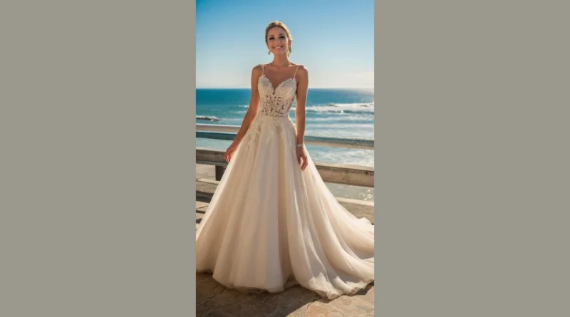 But who needs a traditional white dress anyway? This dress shows that a little color can add so much personality. It’s elegant, it’s romantic, and most importantly, it’s uniquely *her*. She looks absolutely radiant, ready to start her happily ever after by the beautiful blue sea. And hey, if the ocean can wear its beautiful shades of blue and green, why can’t a wedding dress have a little bit of flair?