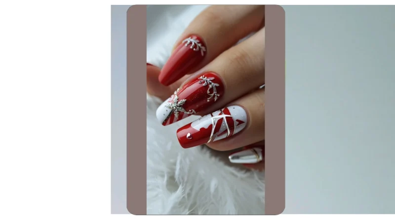 These nails are seriously festive! Look at those dazzling red and white designs – candy canes, snowflakes, and even some fancy gold swirls! They’re like tiny Christmas ornaments for your fingertips, ready to sparkle at the holiday party. I bet they’d look amazing holding a mug of hot cocoa by the fireplace. No need for extra decorations when your nails are this much fun!