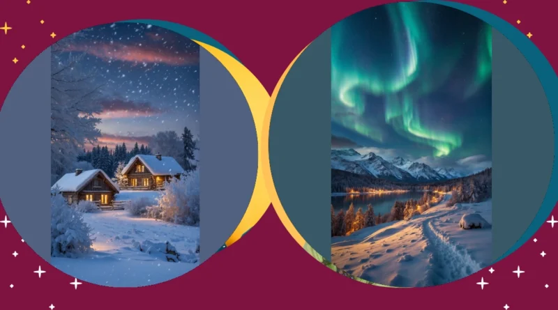 Well, hello there, November! This picture totally skipped Thanksgiving and went straight for the full-blown winter wonderland vibe, didn’t it? It’s like Mother Nature decided to dump a giant bag of marshmallows all over these adorable cabins, just so we’d have the perfect excuse to stay inside with a ridiculously big mug of hot chocolate. Those trees are already sparkling, and the sky looks like someone painted it with cotton candy colours, proving that even early winter knows how to put on a show before the serious snow hits.