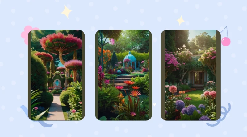 Imagine a world where flowers bloom in every color imaginable, and a magical blue gazebo sits in the middle of it all, waiting for you to explore. This secret garden is like a rainbow exploded, but instead of colors on the ground, they’re climbing trees and dancing on the wind! You’d think it was straight out of a fairytale, with paths winding through a sea of leaves and flowers that could make your head spin.