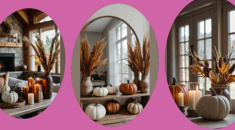 This image shows a super stylish way to decorate your home for fall without going overboard with the orange and brown. The fluffy dried grasses are super trendy, and they look beautiful against the white pumpkins! It’s like a cozy autumn scene straight out of a magazine. The white pumpkins add a touch of elegance, and the dried grasses add a touch of warmth, which is perfect for the fall season. You can definitely make this look yourself; just grab some dried grasses, a few pumpkins, and a big, beautiful mirror and you‚Äôre good to go. You’ll have the most stylish fall decor in your whole neighborhood!