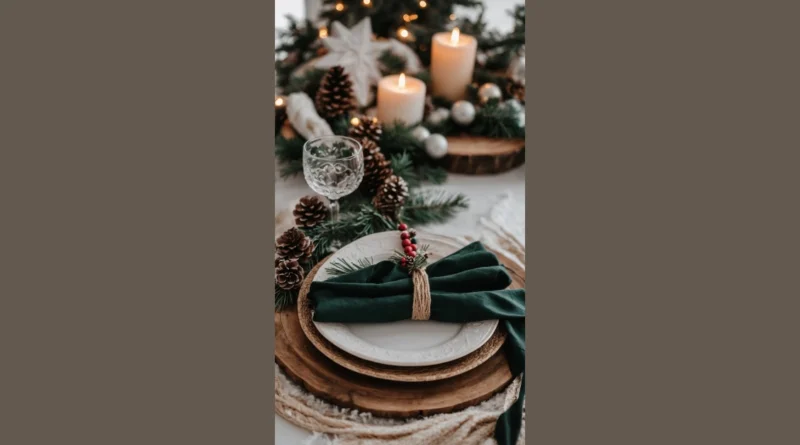 Then there’s the dinner setup, which is basically an art project you can eat off of! Look at that napkin: neatly folded, tied with some rustic twine, and topped with cute little red berries and a tiny sprig. It’s like a mini gift for each plate, showing off your awesome DIY skills without actually having to craft for hours. Who knew a simple piece of string and a few outdoor finds could make a plain napkin look like it belongs in a fancy magazine? And pairing those white plates with a cool, natural wood charger adds instant ‘rustic chic’ vibes. It’s proof that with a little creativity and stuff you can find practically anywhere, your winter room decor can go from ‘blah’ to ‘ta-da!’ even if you’re just decorating for your next pizza night.