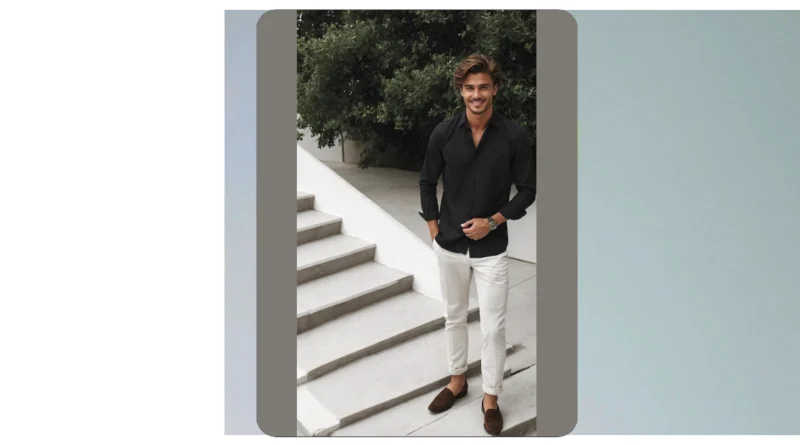 Notice how the light pants pop against the black shirt? It’s a classic combo that makes the whole shirt outfit just work, and he even gets bonus points for the perfectly cuffed ankles showing off those super comfy-looking brown loafers. Plus, that confident smile? It’s probably because he knows he looks good and feels great in his chosen threads. Even his hair looks like it had its own personal stylist, making this whole vibe proof that a well-put-together shirt outfit can make you ready to take on the day with style and a grin!