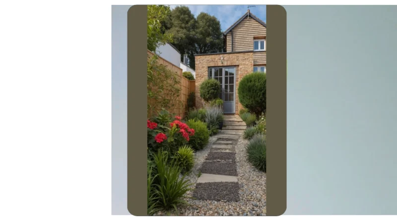 This front garden landscape isn’t just a patch of dirt; it’s practically a VIP entrance for your daily adventures. You’ve got this cool stepping-stone path that looks like it was designed for a hobbit with excellent taste, all surrounded by pebbles that probably make a satisfying crunch sound as you walk. On either side, there’s a party of plants – bright red flowers practically waving hello, while other leafy greens stand tall, probably whispering secrets about the best spots to get sun. It’s a whole mood, making even the quickest trip to the mailbox feel like a grand expedition.