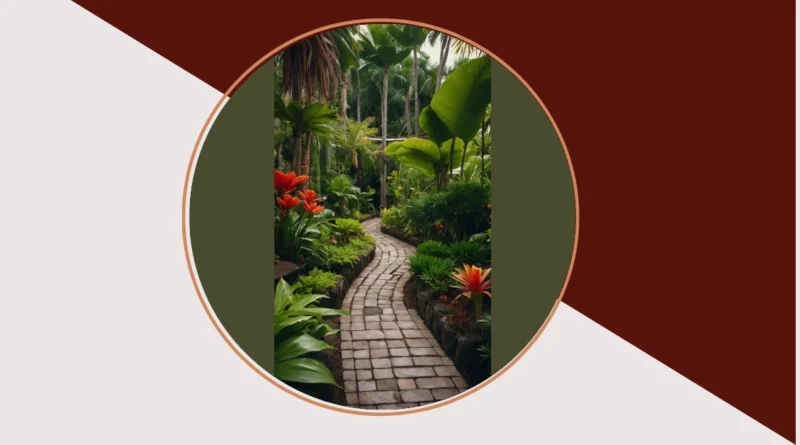 Imagine walking through this garden, the air thick with the smell of exotic flowers and the sound of birds chirping in the trees. You might even hear the gentle rustle of leaves as a breeze passes through. It’s easy to feel like you’ve been transported to a faraway land, even though you’re probably just in someone’s backyard! The winding path, made of cool stone blocks, is just begging you to explore. It’s almost like it’s whispering, “Come on, adventure awaits!” Who knows what you might find hidden amongst these lush tropical plants? Maybe a secret waterfall, a talking parrot, or even a friendly giant?