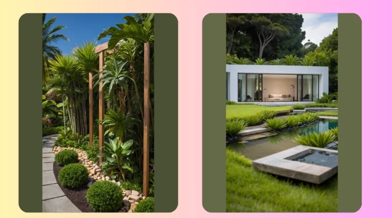 This isn’t your grandma’s garden! Just look at this awesome tropical garden design—it’s like stepping into a lush jungle without even leaving your backyard. Imagine relaxing by the pathway, surrounded by super-cool plants like those giant leafy beauties and perfectly sculpted shrubs. Those wooden posts? They’re not just for looks; they add a touch of zen to this already amazing, vibrant scene, making the whole place feel like a hidden oasis.