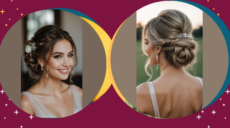 Getting ready for a wedding as a bridesmaid means looking stunning but also being ready for anything – from holding bouquets to busting out dance moves. This epic updo, with its fancy braids and neat bun, is like a secret superpower for your hair! It keeps every strand perfectly in place, so you won’t end up looking like you wrestled a tornado by the time the dessert arrives. Just think: zero flyaways ruining your selfie with the bride, and no sticky strands accidentally dipping into the appetizers while you’re trying to mingle!