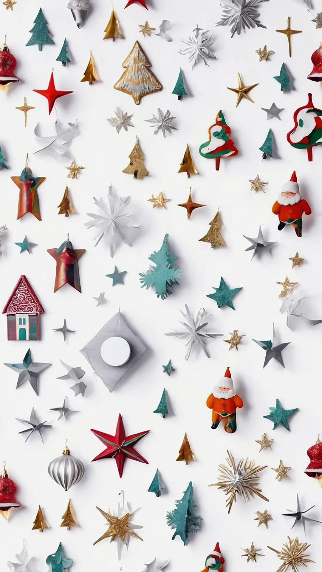 The image is like a Christmas explosion of tiny ornaments and decorations scattered across a white background! It’s like someone opened a dusty box of vintage Christmas decorations and decided to have some fun with them. There’s a tiny Santa, sparkly stars, fluffy trees, and even a tiny little house that looks like it was built by elves! Imagine your iPhone screen covered with all these festive goodies – wouldn’t it be the perfect way to get into the holiday spirit?