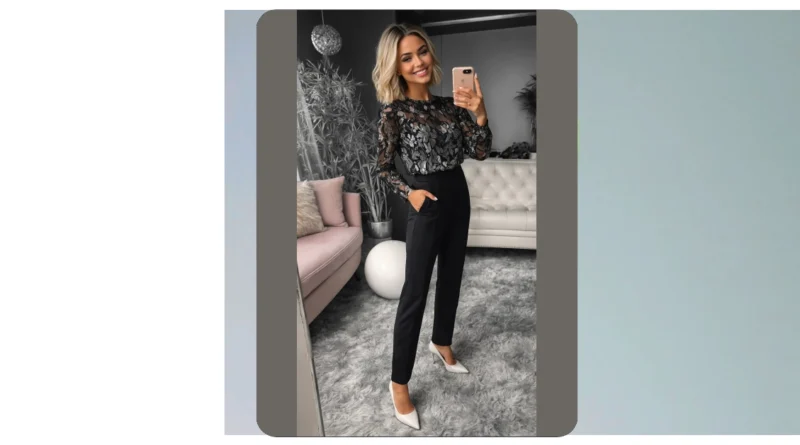 Who’s ready to outshine the Christmas tree? This outfit, with its gorgeous sparkly top and super chic black pants, is basically your secret weapon for all those holiday parties. You’ll be looking so fabulous, people might mistake you for a present that just unwrapped itself. And those pointy heels? They’re ready for any impromptu dance-off or a speedy escape from Aunt Carol’s questions about your future.