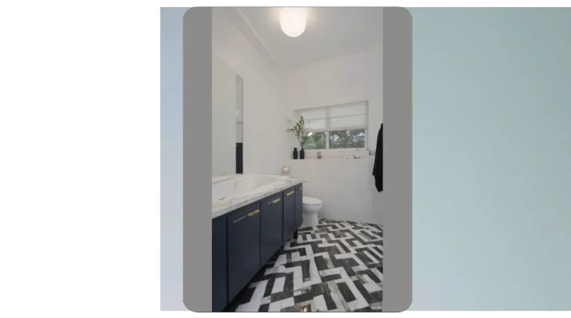 Beyond the awesome maze-like floor, peep that sleek navy vanity with its fancy gold handles. Getting ready here probably feels less like a morning rush and more like a high-fashion prep session. The clean white walls and those tidy subway tiles make everything feel super fresh and bright, like the whole room just took a refreshing shower itself! This remodel isn’t just about looking good; it’s about transforming a plain old room into a cool, calm, and collected spot where even the toilet looks surprisingly chic. No more fighting over who gets to use the nicer bathroom!