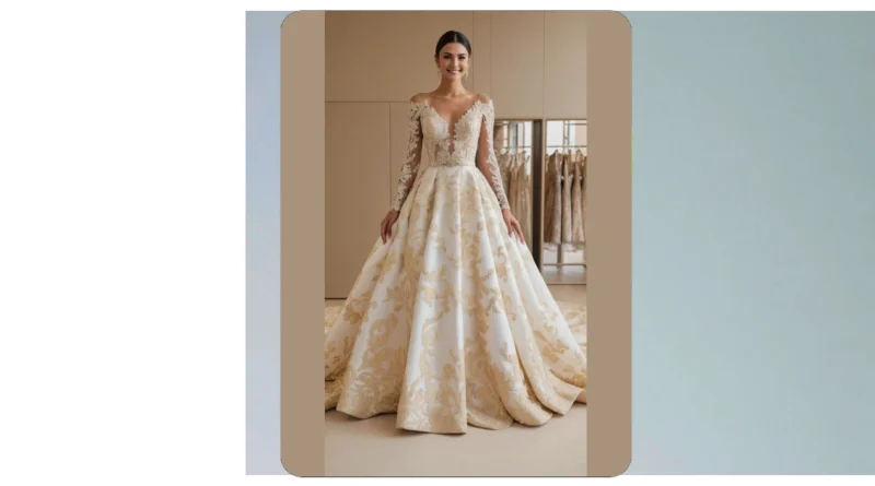 Seriously though, this dress is unbelievably gorgeous. The way the gold embroidery twinkles and shines on the white fabric is magical. It’s not just a dress; it’s a work of art! You could almost imagine a queen wearing it, though frankly, this dress looks best on someone who isn’t afraid to sparkle and shine. This isn’t your grandma’s wedding dress—this is the future of fabulous!