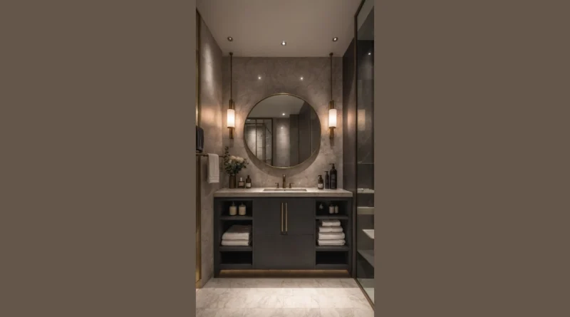 Look at those awesome built-in shelves! Who knew a few neatly stacked towels and some cool-looking soap bottles could make a bathroom look so grown-up and organized? Those little candles aren’t just for emergencies; they add a super cozy, chill vibe, making it feel like a fancy retreat. Plus, the lighting, from the cool wall lamp to the bright ceiling spots, makes everything glow just right. It’s all about those thoughtful bathroom interior design choices that turn a basic washroom into a serene hangout spot where you can unwind and maybe even practice your future award-winning shower singing.
