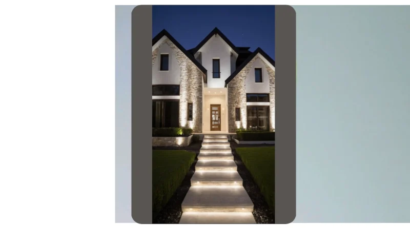 Look at this place! It’s like this house is auditioning for a movie role and totally nailing it. The ‘front house design’ here isn’t just a bunch of walls and windows; it’s a whole vibe. Those steps, all lit up like a personal runway, practically roll out the red carpet for anyone approaching. And the mix of that cool stone and crisp white stucco? It’s like the house decided to put on its best outfit for a night out, and honestly, it looks amazing – especially with the dark sky as its perfect backdrop.