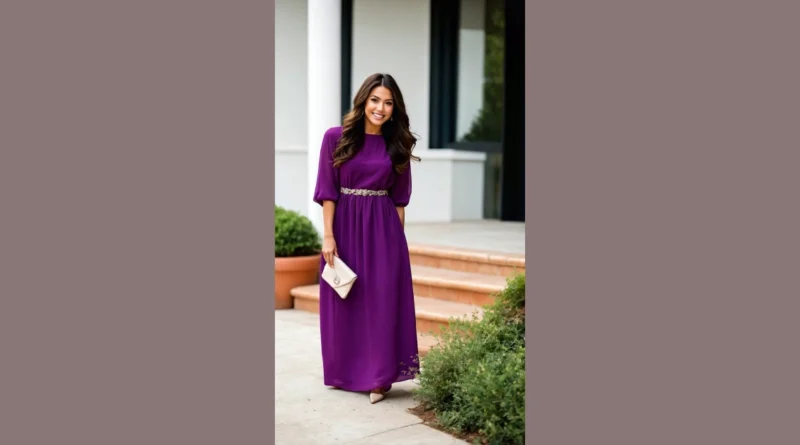 This gorgeous purple dress is practically screaming “wedding guest done right!” With its flowy fabric and those fun, slightly puffy sleeves, you’ll look totally chic without feeling like you’re trying too hard. The sparkly belt is the perfect touch, adding a bit of glam that says, “Yes, I know how to accessorize,” while still keeping it classy enough not to upstage the bride (a key rule of wedding etiquette, as you know!). Plus, a maxi dress means you can totally hide those comfy flats you swapped into after an hour of heels. Shhh, it’s our secret!