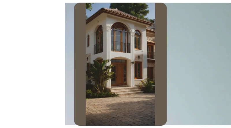 The entryway, with its arched doorway and elegant wooden doors, invites you to step inside and explore. The big stone steps leading up to the front door are like a stairway to a world of luxury and comfort. Just imagine yourself sipping a glass of lemonade on the balcony, watching the sunset over the sparkling sea. It’s a dream come true, right?