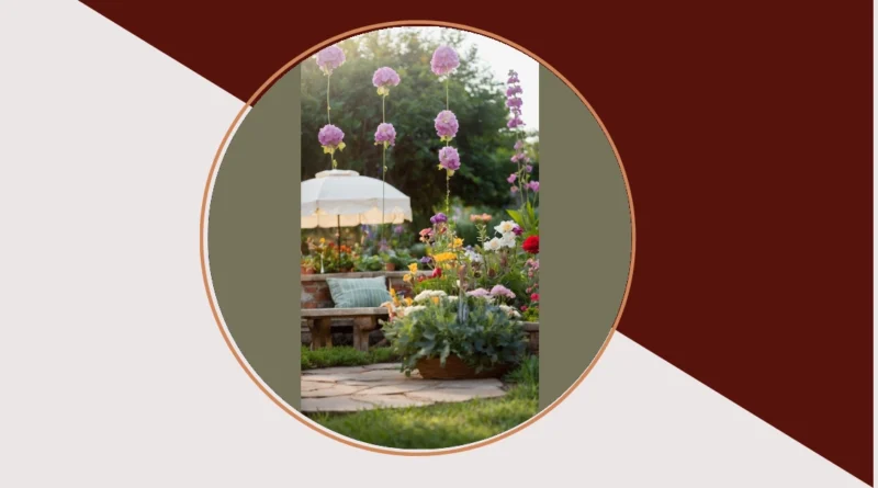 This flower garden is seriously rocking! Imagine relaxing under the parasol with a lemonade, surrounded by a rainbow of blooms. Those tall, elegant pink flowers are like a fairytale princess’s parade, marching right into a super cozy patio scene. It’s the perfect spot for a summer afternoon hangout, maybe even a picnic – just watch out for the sneaky bumblebees who are probably having a party of their own amongst the flowers!