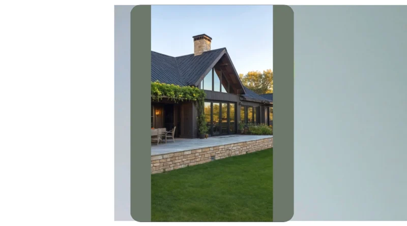 Forget those old-school, dusty farmhouses; this place got a serious glow-up! The dark wood siding mixed with that cool stone foundation gives it a look that’s both rugged and super sleek, like it’s ready for both a fancy dinner party and a casual bonfire. And that sharp, angled roof? It’s not just for looks; it probably keeps out all the bad vibes (and maybe the occasional squirrel trying to sneak in). Honestly, if this were my house, my biggest problem would be deciding whether to relax on the patio or just roll around on that perfectly green lawn all day.