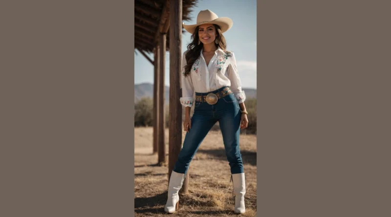 Beyond the mystery hat, let’s zoom in on the rest of this fantastic Mexican rancho outfit! That embroidered blouse is a total showstopper, with patterns so cool they probably tell a whole story. Paired with those classic wide-leg jeans and a belt buckle that means business, it’s the perfect mix of traditional charm and modern cool. It makes you wonder if she’s about to wrangle some wild horses or just heading to the trendiest taco stand in town looking effortlessly amazing. Either way, this look proves you can be super stylish while still totally blending in with a dusty, gorgeous ranch backdrop.