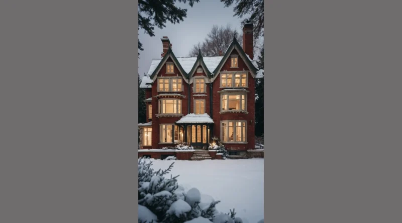This house is seriously goals! Just imagine sipping hot cocoa by the fireplace inside, while the snow gently falls outside. It’s like something out of a fairytale, all white and grand with perfectly trimmed bushes. Even the snowy driveway looks fancy, like it’s ready for a sleigh pulled by magical reindeer. This winter house exterior is the epitome of cozy and majestic; it’s the perfect blend of beautiful architecture and winter charm.
