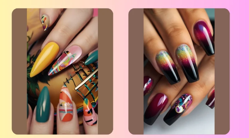 Forget about boring plain colors ‚Äì these nails are like a party on your fingertips! They’ve got all the shades of the rainbow, mixed together in a cool, abstract design. You know what they say ‚Äì if you’re feeling a little down, just paint your nails and it will lift your spirits. So, if you want to be the trendsetter in your friend group this month, ditch the basic manicure and go for something totally wild! You’ll be thanking yourself later, when you’re walking around with the most awesome nails in town!