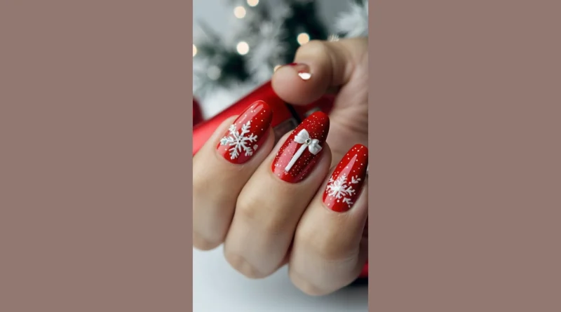 These nails are seriously festive! Imagine sipping hot cocoa by a roaring fire, wearing a cozy sweater (just like in the picture!), and showing off your super cute red Christmas nails. The sparkly snowflakes add that extra touch of magic, like tiny little winter wishes on your fingertips. They’re perfect for holiday parties, family gatherings, or just because you deserve some extra sparkle in your life.