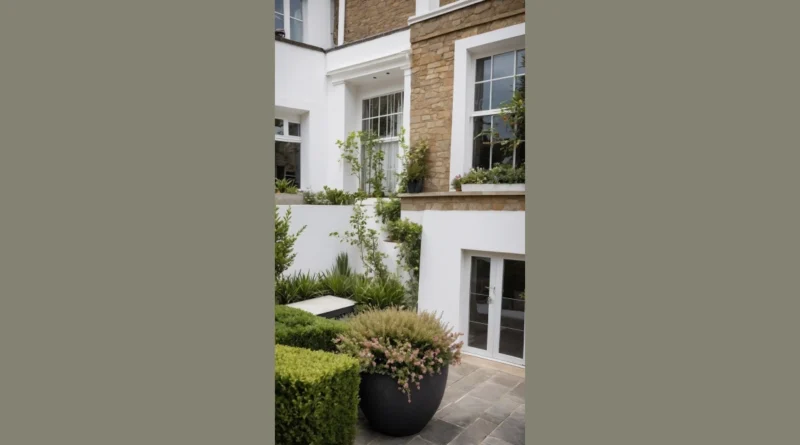 This front garden is basically flexing on all the other gardens in the neighborhood. It’s got layers, like a fancy wedding cake but instead of frosting, it’s all gorgeous plants and crisp white walls. You’ve got these neat little hedges on the ground floor looking all disciplined, then plants climbing up the walls like they’re trying to escape a boring life, and others chilling in their raised beds, probably gossiping about the humans inside. It’s like a plant-party that’s always looking photo-ready, making every other lawn feel a little underdressed.