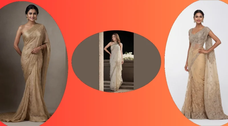 Check out this look! This model is absolutely rocking a super elegant saree, and seriously, she looks like she just floated out of a fairytale. The creamy color with all that gold sparkle is giving major princess vibes, but like, the cool, modern kind who also nails her exams. It’s not just any saree, though; the way it’s draped highlights that amazing one-shoulder saree blouse, making it look totally effortless and chic. You know, the kind of outfit that probably took hours to get just right, but she makes it look like she just threw it on after a casual spa day.