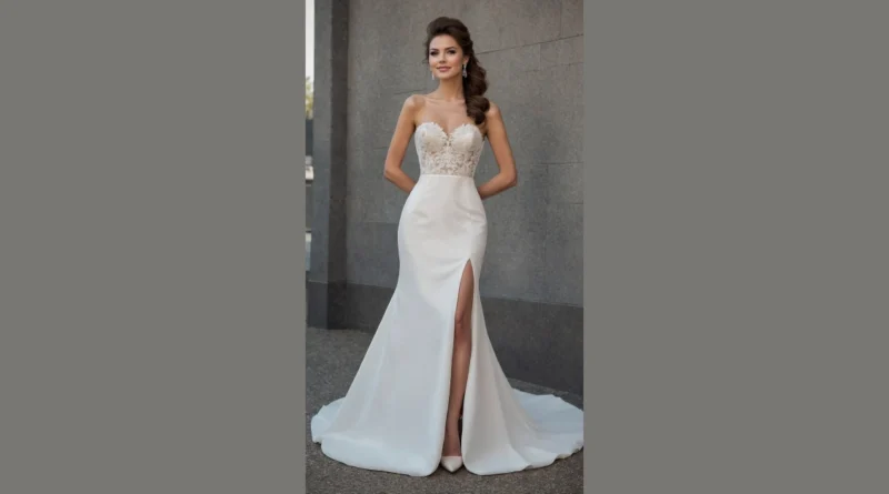 This stunning white dress really makes a statement, looking like something a celebrity would wear on their big day – definitely a contender for a ‘top wedding dress’ list! With that sleek fit and gorgeous lace bodice, it’s giving off major “I woke up like this, flawless” vibes. You just know whoever wears this is going to float down the aisle feeling like a queen, probably ready to perfectly pose for a million photos, even if their inner monologue is secretly screaming, “Don’t trip! Don’t trip!”
