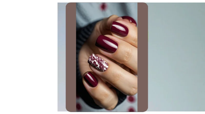 And just when you thought it couldn’t get any better, BAM! Check out that accent nail. It’s like the little rebel of the group, rocking a super intricate white design with that same gorgeous maroon. It’s proof that you don’t have to be a matchy-matchy masterpiece; a little bit of pattern can go a long way to show off your personality. So, if you’re ever stuck on what to do with your nails, this pic is basically a cheat code for turning simple maroon into a total showstopper. Get ready to have everyone asking where you got your nails done!
