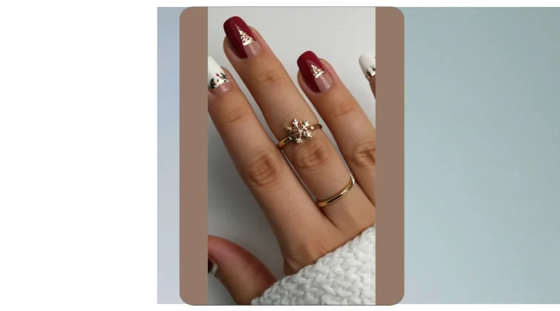 Seriously, though, the combination of the red and white polish with the tiny gold trees and that snowflake ring is pure Christmas magic! It’s the perfect way to show off your holiday spirit without going overboard. Plus, you know how everyone loves a good accessory, right? That ring is the cherry on top of this festive nail sundae.