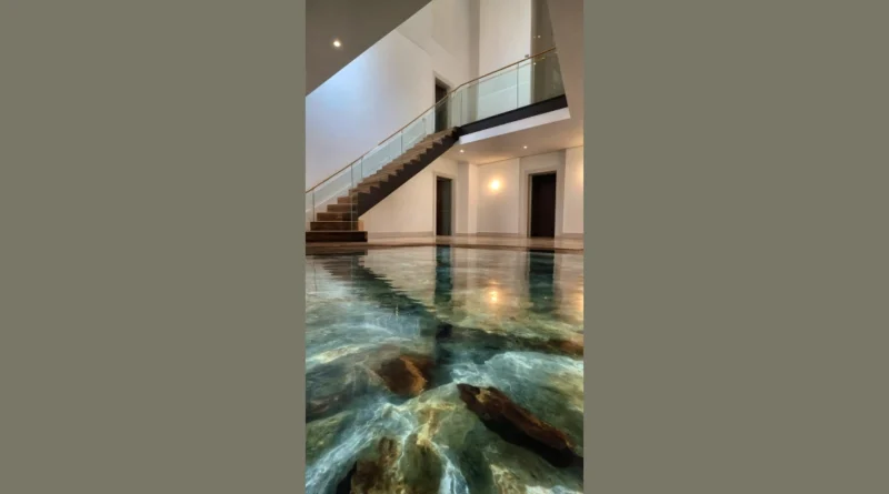 Hold on a minute, did someone just install a mini-ocean inside this building? Nope, you don’t need your floaties, because what you’re actually seeing isn’t water, it’s the incredible magic of epoxy flooring! This super cool, shiny blue surface makes it look like you’re literally walking on the clearest, bluest lake, complete with those awesome ripple effects. It’s like having your own personal art exhibit under your feet, making every step feel like a trip to an underwater wonderland without any of the damp socks or accidental cannonballs.