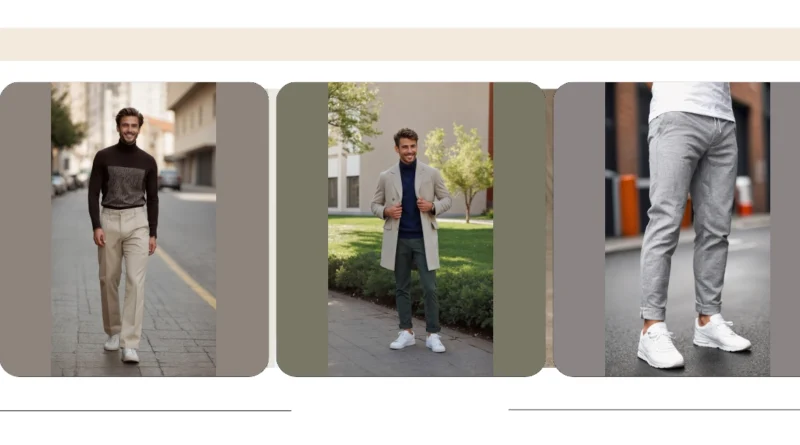 What truly pulls this whole ‘pants outfit for men’ together is how those snazzy khaki pants pair up with everything else. That crisp white turtleneck adds a touch of “I’m sophisticated, but still approachable,” while the dark denim jacket says, “I’m ready for anything, maybe even a spontaneous pizza run.” And let’s not forget those squeaky-clean white sneakers that make him look like he’s about to drop some wisdom or just casually stride into a photoshoot. It’s an easy combo that makes you look like you’ve got life totally handled, even if you’re still trying to remember where you left your charger.